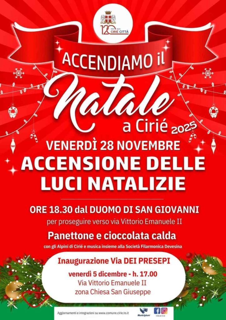 Accendiamo il Natale a Ciriè Bookmark Data28 Novembre 2025 Ora6:30 pm Informazioni di contatto Duomo di San Giovanni, 10073, Ciriè 011 9218111 protocollo@comune.cirie.to.it Caratteristiche 1 2 3 4 50.000 Manifestazioni di Natale Ciriè