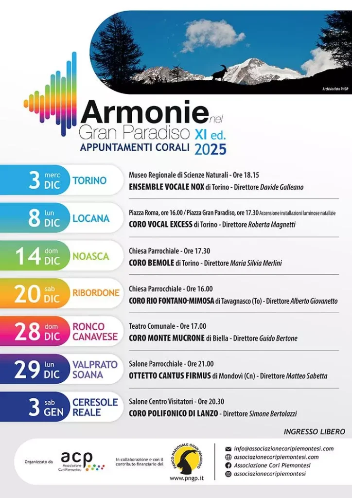 Armonie nel Gran Paradiso 2025 Bookmark Data20 Dicembre 2025 Ora4:00 pm Informazioni di contatto Ribordone, 11012, Parco Nazionale Gran Paradiso info@associazionecoripiemontesi.com https://www.associazionecoripiemontes... Caratteristiche 1 2 3 4 50.000 Concerti ed Eventi Musicali Parco Nazionale Gran Paradiso