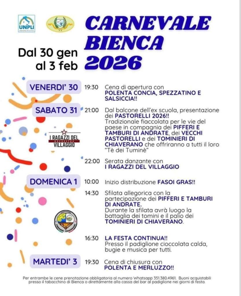 Carnevale di Bienca 2026 Bookmark Data30 Gennaio 2026, 31 Gennaio 2026, 1 Febbraio 2026, 3 Febbraio 2026 Informazioni di contatto Frazione Bienca, 10010, Chiaverano prenotazione cene: 351 3804961 Caratteristiche 1 2 3 4 50.000 Manifestazioni di Carnevale Chiaverano