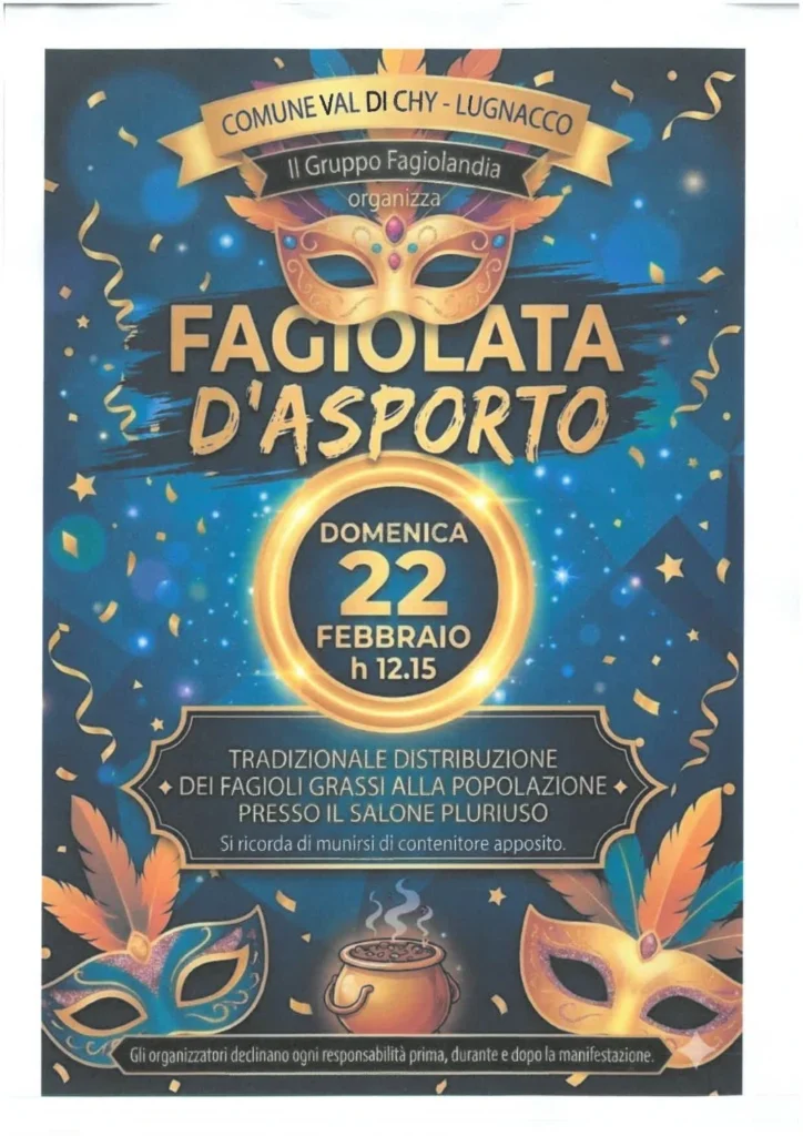 Fagiolata d'asporto Bookmark Data22 Febbraio 2026 Ora12:15 am Informazioni di contatto Frazione Lugnacco, 10080, Val di Chy 0125.78402 protocollo@comune.valdichy.to.it Caratteristiche 1 2 3 4 50.000 Sagre ed Eventi Enogastronomici Val di Chy