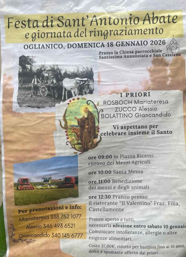 Festa di Sant'Antonio Abate Bookmark Data18 Gennaio 2026 Ora9:00 am Informazioni di contatto Chiesa parrocchiale Santissima Annunziata e San Cassiano, 10080, Oglianico 338 7521077 - 346 4936521 - 340 1456777 Caratteristiche 1 2 3 4 50.000 Feste Patronali e Religiose Oglianico