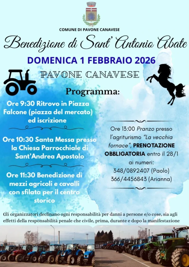 Festa di Sant'Antonio Abate Bookmark Data1 Febbraio 2026 Ora9:30 am Informazioni di contatto Piazza Falcone, 10018, Pavone Canavese 348 0892407 - 366 4456843 Caratteristiche 1 2 3 4 50.000 Feste Patronali e Religiose Pavone Canavese