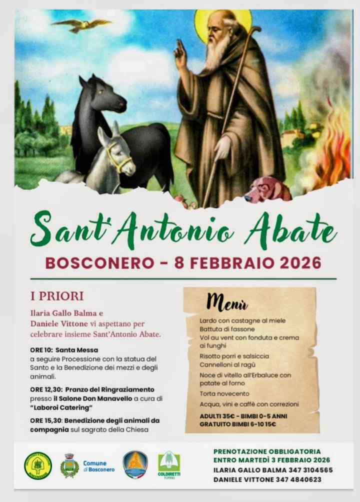 Festa di Sant'Antonio Abate Bookmark Data8 Febbraio 2026 Ora10:00 am Informazioni di contatto Sedi varie, 10080, Bosconero 347 3104565 - 347 4840623 Caratteristiche 1 2 3 4 50.000 Feste Patronali e Religiose Bosconero