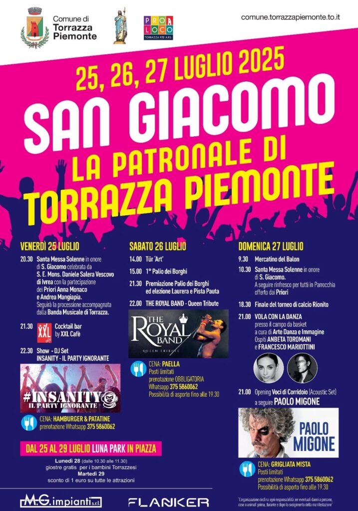 Torrazza Piemonte è pronta a celebrare la Festa di San Giacomo con un programma ricco di eventi che animeranno il paese dal 25 al 28 luglio 2024.