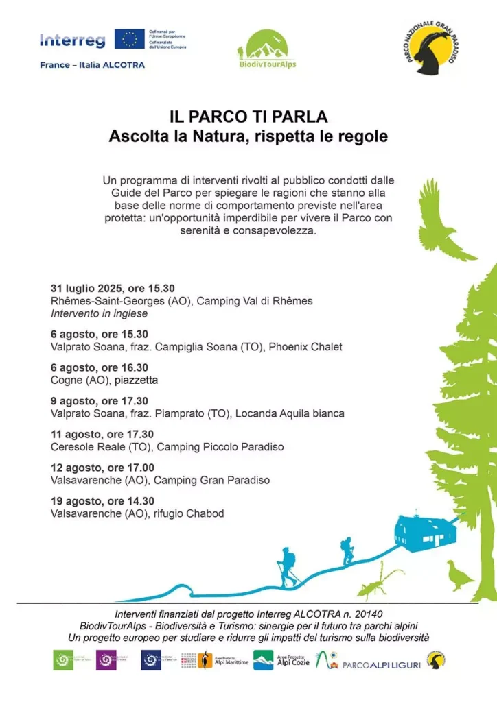 Le Guide del Parco accompagneranno il pubblico in brevi interventi divulgativi, illustrando, in italiano – e in inglese nella tappa di apertura – le ragioni alla base dei divieti e delle buone pratiche adottate per preservare ecosistemi, flora e fauna alpina. Un’occasione per comprendere come ogni escursionista possa contribuire alla salvaguardia del territorio.