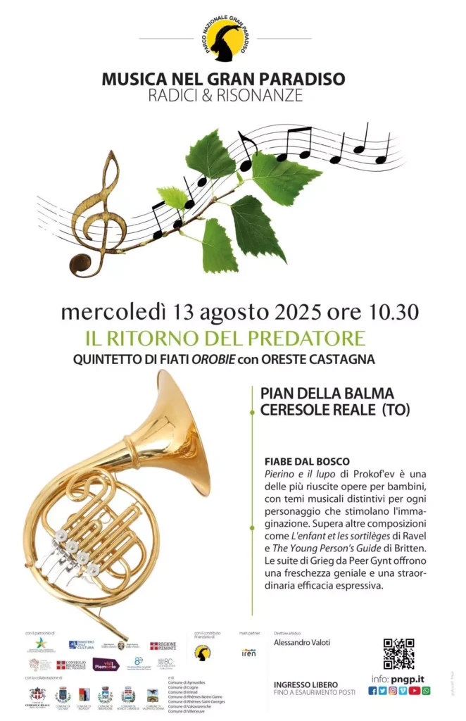 Nell’ambito della rassegna Musica nel Gran Paradiso: Radici e Risonanze è in programma l’evento Il ritorno del predatore. Appuntamento mercoledì 13 agosto 2025 alle ore 10.30 presso Pian della Balma a Ceresole Reale.