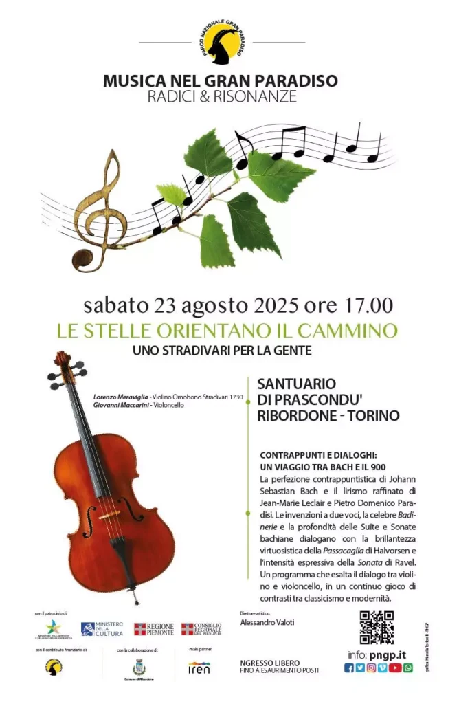 Nell’ambito della rassegna Musica nel Gran Paradiso: Radici e Risonanze è in programma l’evento Le stelle orientano il cammino. Appuntamento sabato 23 agosto 2025 alle ore 17 presso il santuario di Prascondù – Ribordone.