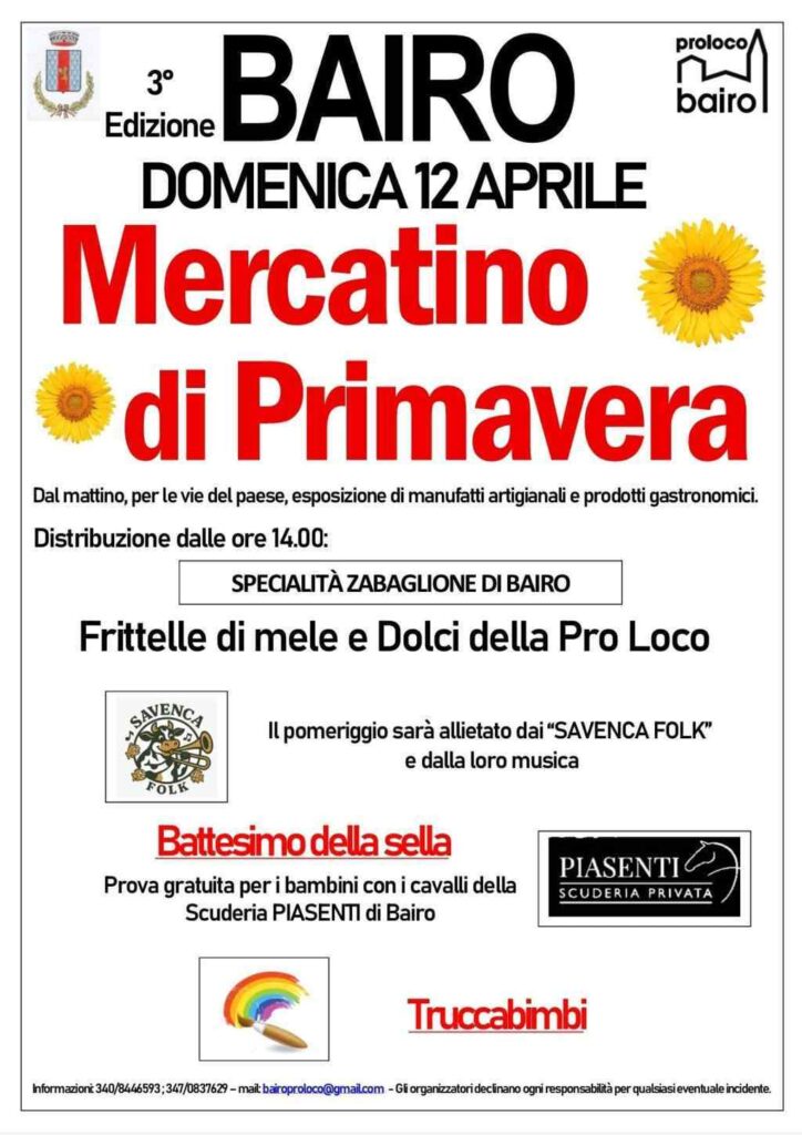 Mercatino di Primavera Bookmark Data12 Aprile 2026 Ora2:00 pm Informazioni di contatto Sedi varie, 10010, Bairo 340 8446593- 347 0837629 bairoproloco@gmail.com Caratteristiche 1 2 3 4 50.000 Fiere e Mercati Bairo