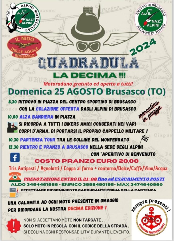 Gli appassionati delle due ruote si preparano per un evento imperdibile che celebra la sua decima edizione: il Motoraduno Quadradula, organizzato dal Gruppo Alpini Motociclisti di Brusasco, si terrà domenica 25 agosto. L’evento è gratuito ed aperto a tutti, con un programma ricco di attività e momenti di convivialità.