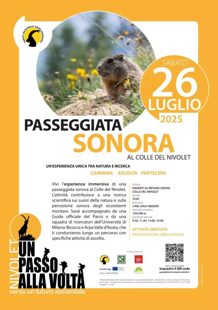 Vivi l’esperienza immersiva di una passeggiata sonora al Colle del Nivolet. L’attività contribuisce ad una ricerca scientifica sui suoni della natura e sulla percezione sonora degli ecosistemi montani.