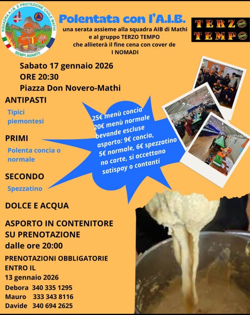 Polentata solidale dell’A.I.B. Bookmark Data17 Gennaio 2026 Ora8:00 pm Informazioni di contatto Piazza Don Novero, 10075, Mathi 340 3351295 - 333 3438116 - 340 6942625 Caratteristiche 1 2 3 4 50.000 Sagre ed Eventi Enogastronomici Mathi