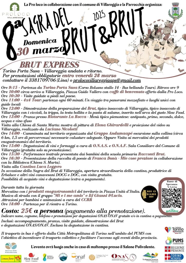 La giornata inizierà con la partenza del Brut Express alle 9:15 da Torino Porta Susa (ritrovo ore 9 in Corso Bolzano, stallo 14, Bus Bellando Tours), con arrivo a Villareggia previsto per le 10:00.