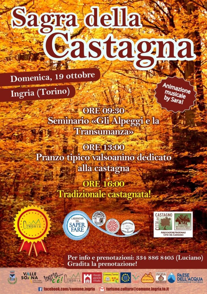 Sabato 19 ottobre ad Ingria torna la “Sagra della Castagna” con tanti eventi. In mattinata, alle ore 9,30, si svolgerà il seminario “La risorsa del castagno, legno e frutto”, in collaborazione con l’associazione francoprovenzale Effepi. Alle ore 13.30 seguirà il pranzo tipico valsoanino (gradite le prenotazioni al nr. 3348868405 entro giovedì 17 ottobre) con dolce dedicato alla castagna e, alle ore 16, l’immancabile castagnata. Durante la manifestazione sarà presente ad Ingria una delegazione del Comune e della Pro Loco di Sestriere per rinnovare il progetto di collaborazione turistica “Le montagne si incontrano”, che ha attivato importanti sinergie fra i due Comuni.