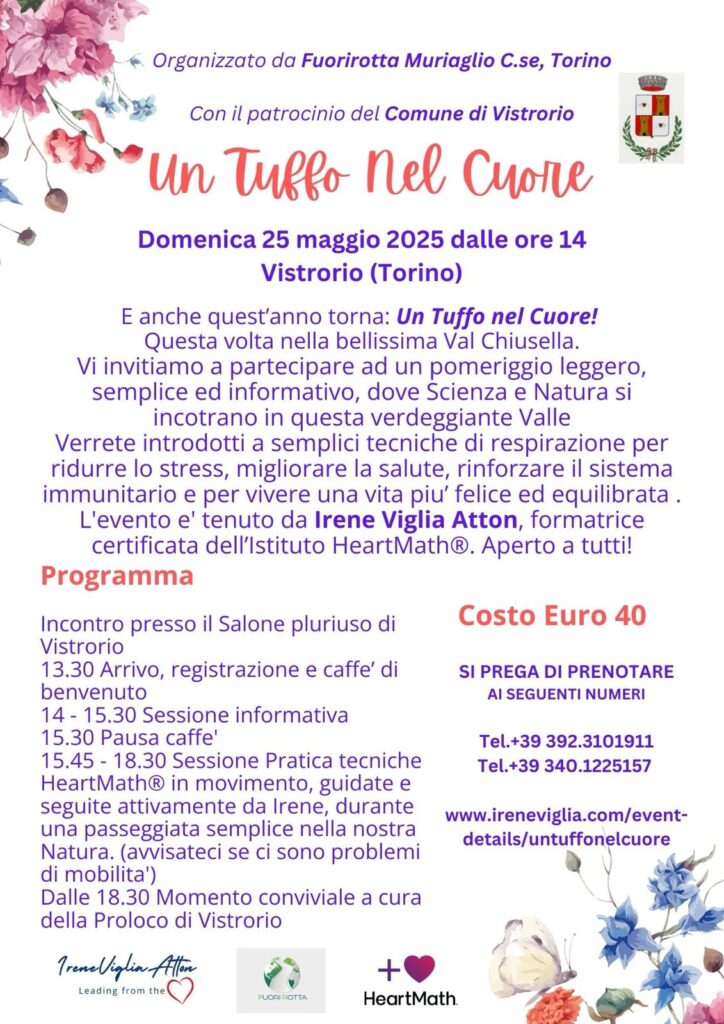 Un pomeriggio per fermarsi, respirare e rimettere in equilibrio corpo e mente. Torna anche quest’anno “Un Tuffo nel Cuore”, l’incontro organizzato da Fuorirotta Muriaglio C.se, Torino, con il patrocinio del Comune di Vistrorio, in programma domenica 25 maggio 2025 a partire dalle ore 14.00 proprio nel cuore della Val Chiusella. Un luogo verdeggiante scelto per ospitare un evento che mette insieme scienza e natura, in una formula semplice, accessibile e benefica. L’appuntamento si svolgerà presso il Salone pluriuso di Vistrorio e sarà condotto da Irene Viglìa Atton, formatrice certificata dell’Istituto HeartMath®, impegnata da anni nella divulgazione di tecniche per la gestione dello stress e il miglioramento della salute.