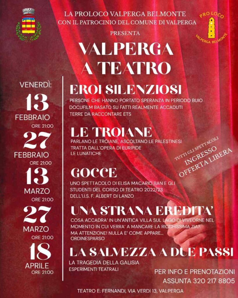 Valperga a Teatro Bookmark Data13 Febbraio 2026, 27 Febbraio 2026, 13 Marzo 2026, 27 Marzo 2026, 18 Aprile 2026 Informazioni di contatto Teatro E. Fernandi via Verdi 13, 10087, Valperga 320 2178805 Caratteristiche 1 2 3 4 50.000 Stagione o Rassegna Teatrale e Cinematografica Valperga